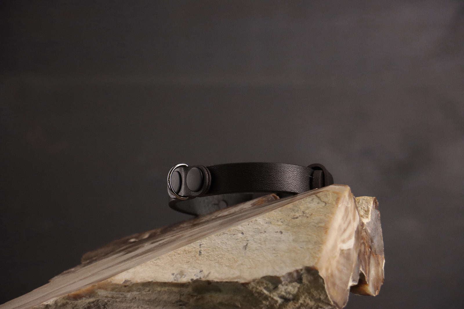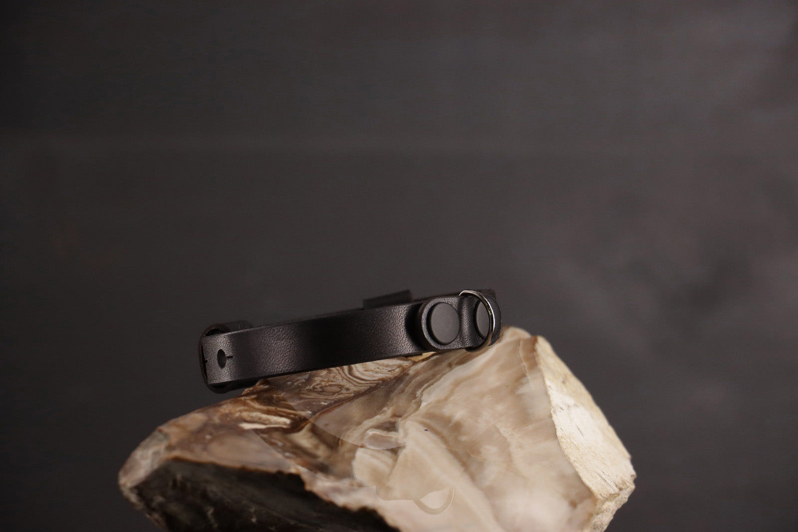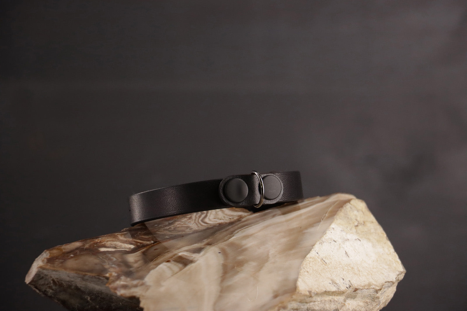 Each collar includes a small, minimalist charm with a gunmetal black d-ring for ID tags—creating a clean, modern silhouette from every angle.